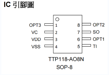 TTP118-AO8N 主要用於 LED 燈光調節及開關控制的單通道按鍵觸摸晶片。使用該晶片可實現